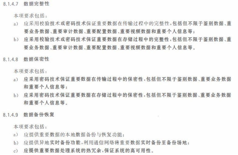- 数据存储完整性保护和保密性保护,针对不同的业务场景,如业务场景对数据存储的完整性要求高,未采取相应措施,则为高风险;如业务场景对数据存储保密性要求高,未采取相应措施,则为高风险。