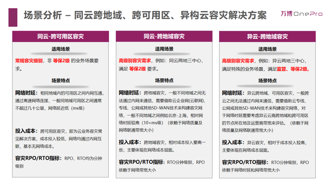 在本次分享中,我们根据等保2.0的常见需求场景,为MSP们和广大企业客户带来同云跨地域、跨可用区和异构云容灾解决方案的各项对比,帮助大家选择适合自己的云容灾解决方案。