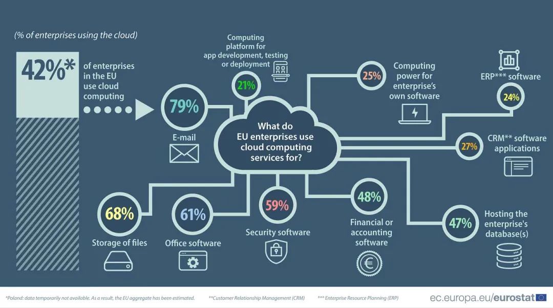 除此之外,企业还使用云来访问更高级的最终用户软件应用程序,例如财务/会计 (48%)、客户关系管理 (27%) 和企业资源规划 (24%)。在最复杂的云服务中,超过半数 (59%) 使用云的企业报告使用安全软件应用程序,47%在云中托管企业数据库,五分之一 (21%) 使用计算平台为应用程序开发提供托管环境、测试或部署。