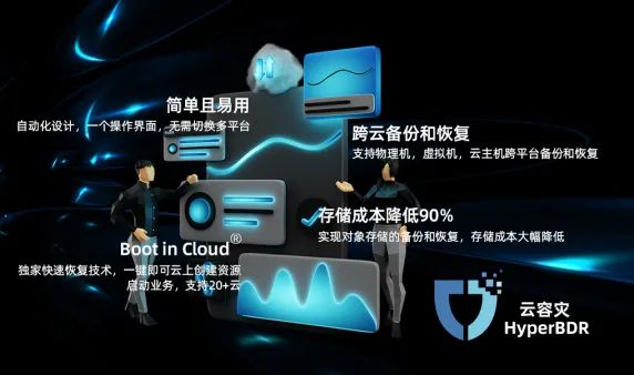 在成本方面,HyperBDR云容灾解决方案采用对象存储作为目标端存储介质,将整机数据切片存储至对象存储,仅在恢复时组合成块数据,这项举措将存储成本降至极低,一年费用仅1.3元/GB,只相当于传统容灾2%的存储成本。