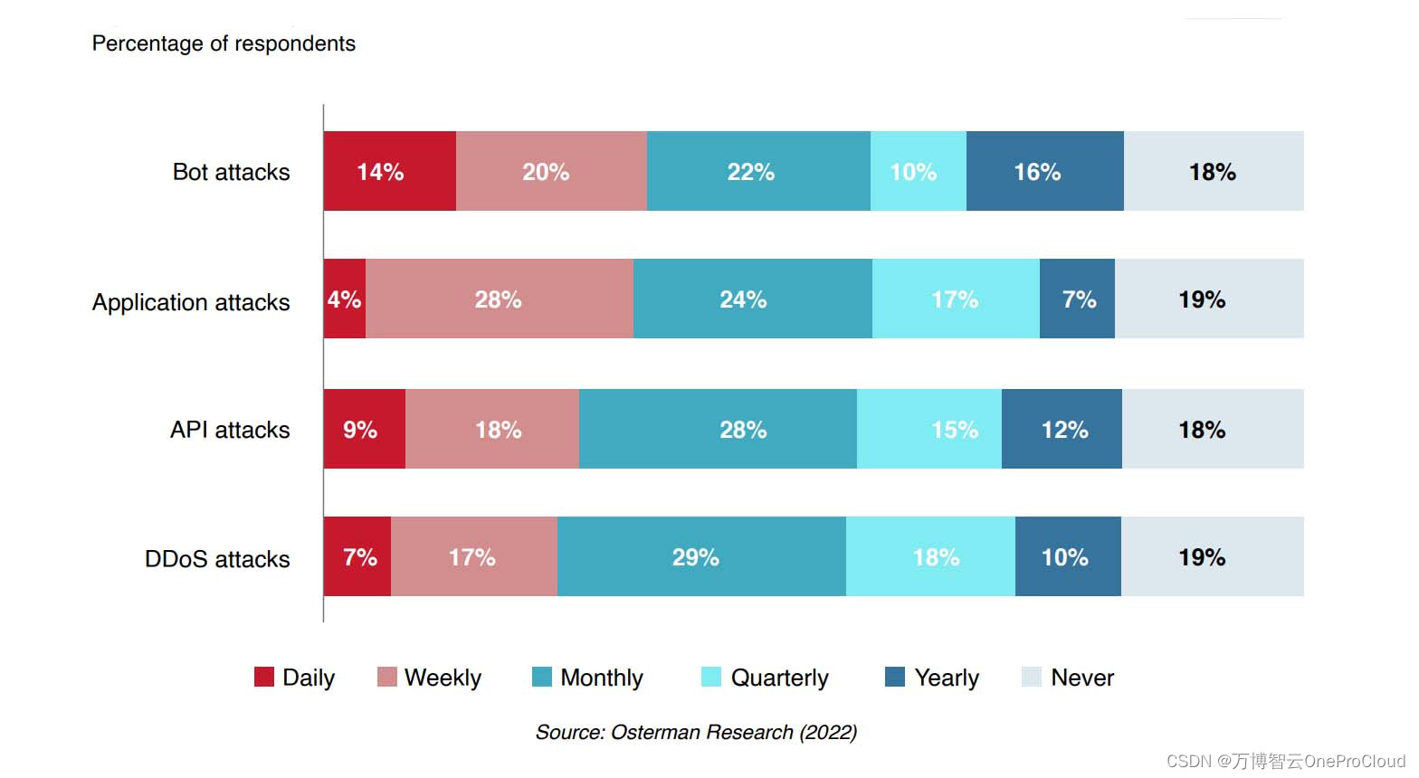 企业最常受到以下四种网络攻击的频繁侵扰,分别为:僵尸攻击、应用程序攻击、API攻击和DDoS攻击。其中僵尸攻击和应用程序攻击更频繁。