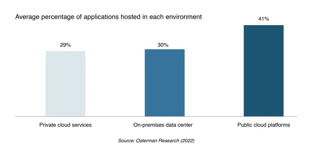 根据Radware的《2022年多云世界中的应用安全报告》显示,大约40%的大型企业将核心业务部署在公共云中,30%的大型企业部署在私有云环境中。这代表70%的生产应用程序部署在云环境中。*本文引用报告调研对象为员工至少拥有1000人的大型企业,下文所提到的“企业”默认为该定义下的大型企业。