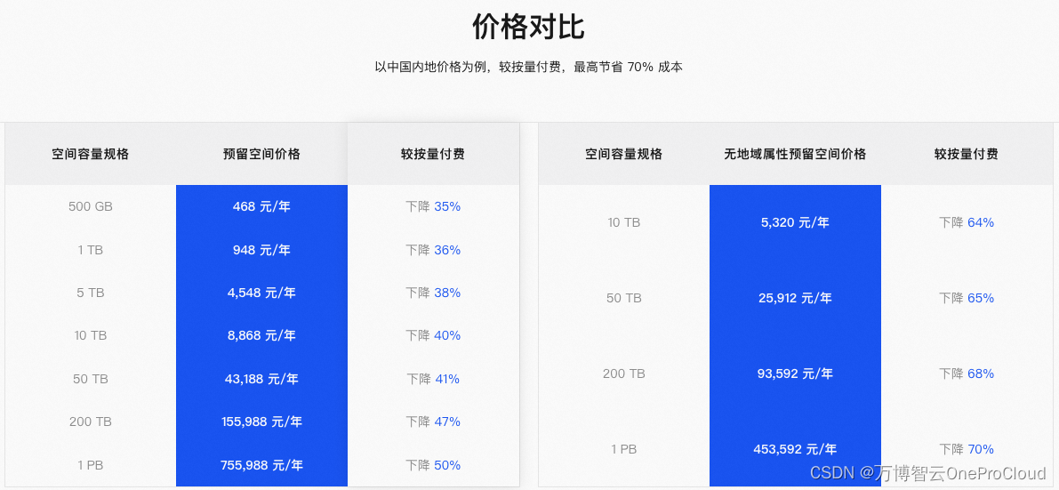 如果客户对数据存储地域无要求,且可以接受仅通过外网进行数据读取,那么也可选择无地域属性预留空间,无地域属性预留空间也有 10 TB到 1PB,4个档位可供选择,而1PB容量的价格比按量付费下降 70%。