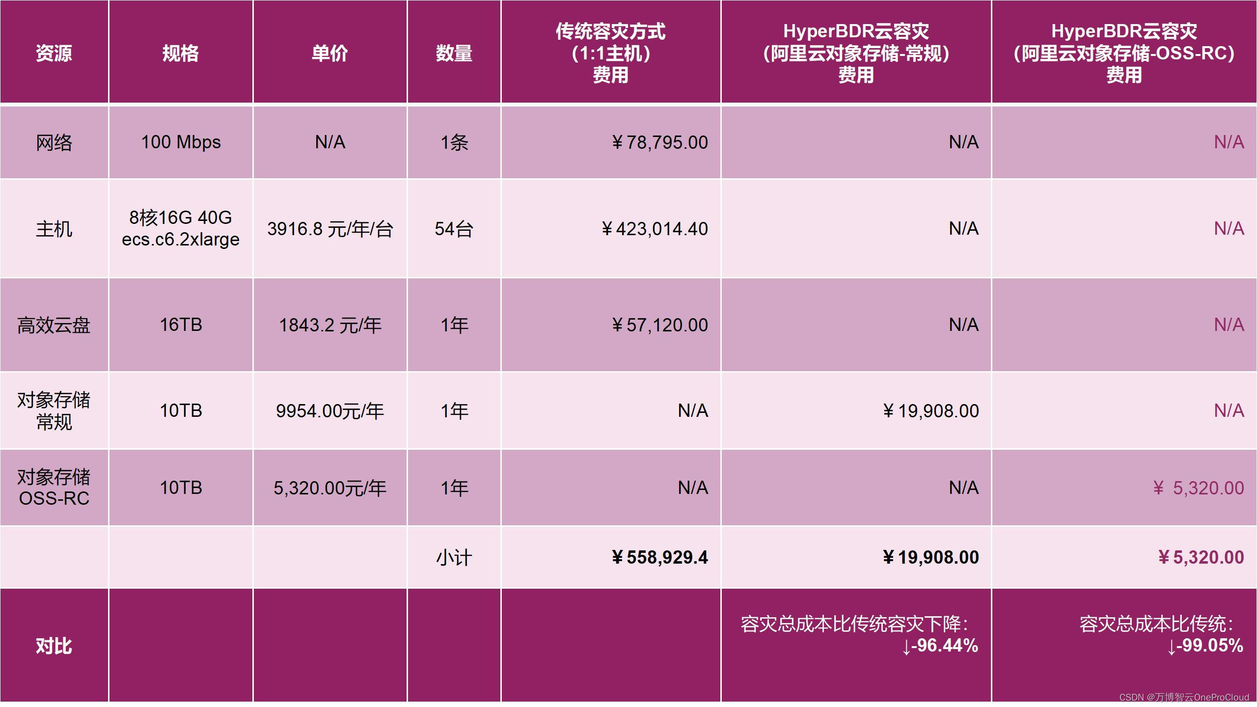 企业可对应选择10TB容量的阿里云对象存储OSS-RC套餐,容灾54台主机,共8TB数据,一年仅需花费19,908元费用。