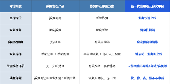市场上的容灾解决方案大致可分为两类:一类是纯粹的数据备份产品,强调数据可用;另一类则尝试提供自动化的业务恢复能力,但多数方案仍旧停留在“恢复即还原”的逻辑层面。业务环境的网络配置、主机实例类型、存储类型、负载入口等因素往往在灾难发生时才匆忙配置,极大增加了恢复时间和人为出错的风险。