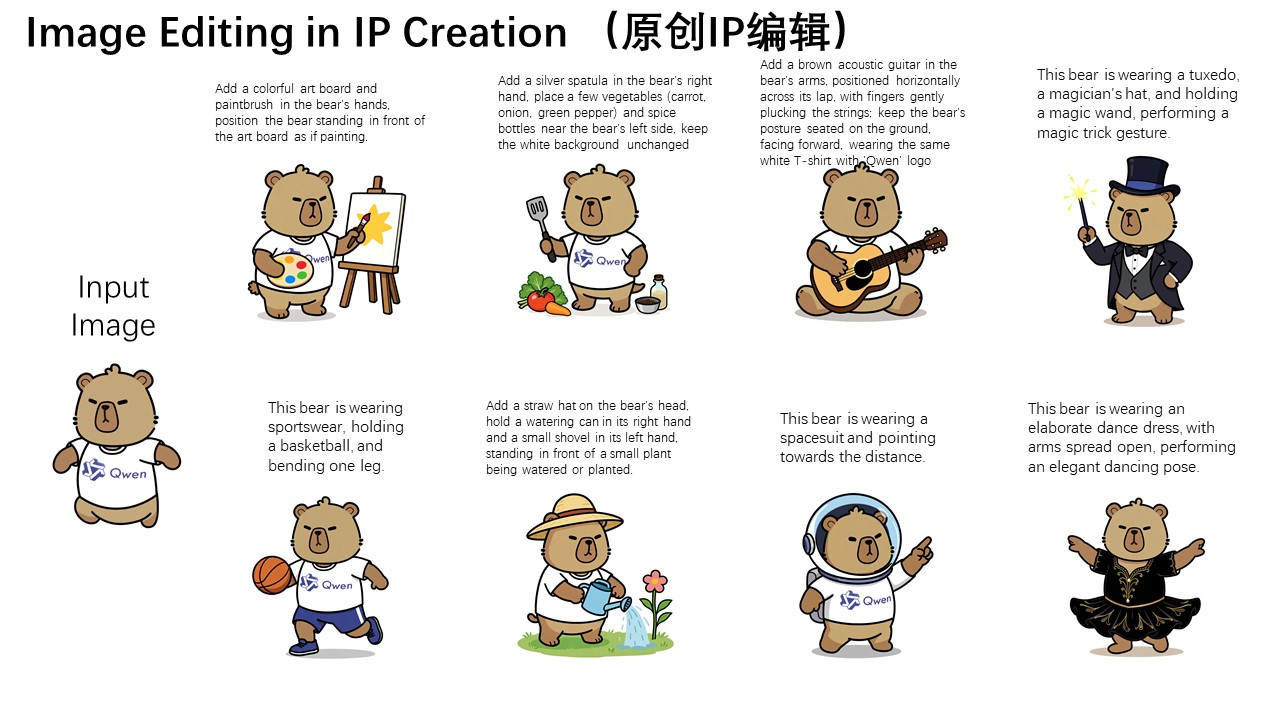 可以看到,虽然编辑后的图像大多数像素与输入图像(最左侧的图)都不一样,但依然完美地保持了卡皮巴拉的角色一致性。Qwen-Image的强大的语义编辑能力使其能够轻松地进行原创IP的多样化创作。