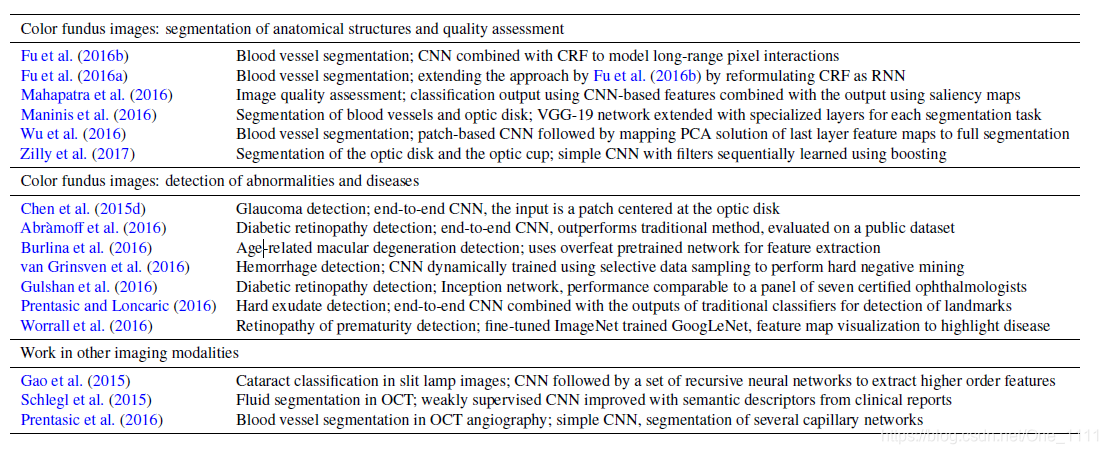 Table 2: Overview of papers using deep learning techniques for retinal image analysis. All works use CNNs.