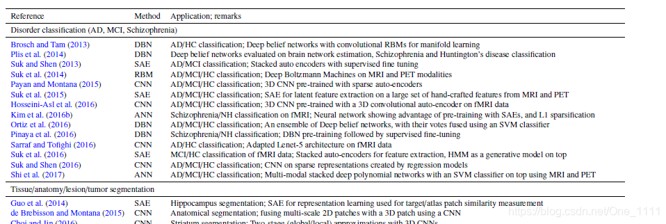 Table 1: Overview of papers using deep learning techniques for brain image analysis. All works use MRI unless otherwise mentioned.
