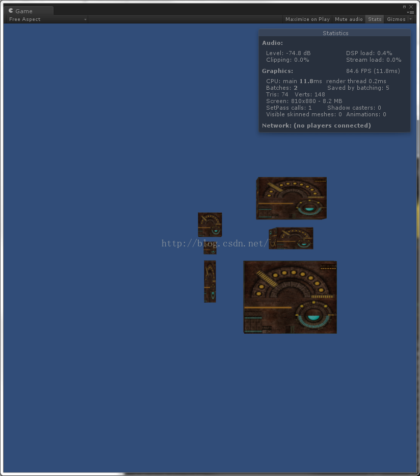 多加了几个物体,Save By Batching是5,SetPass Call是1,就是说我们仍然做了批处理,DrawCall还是1。