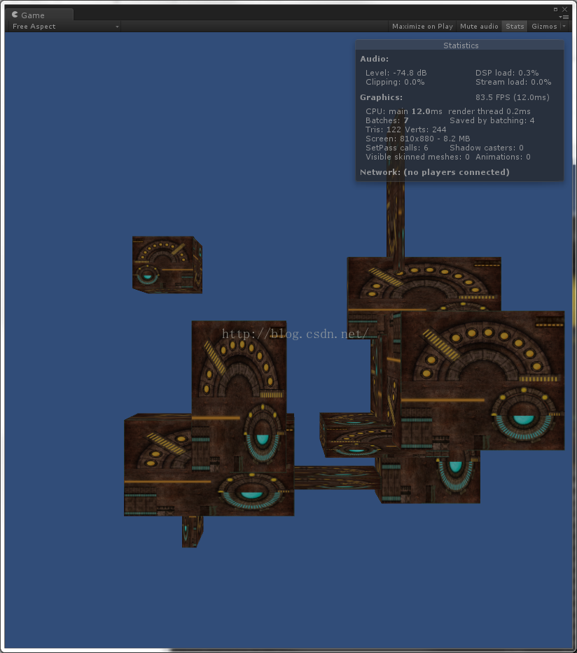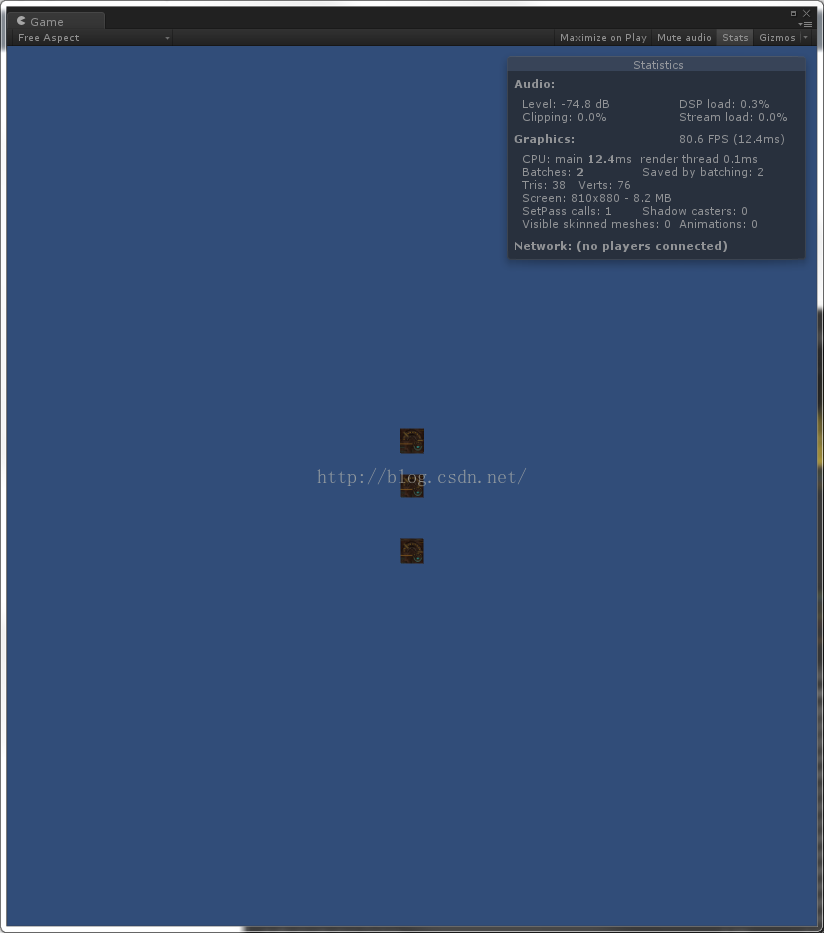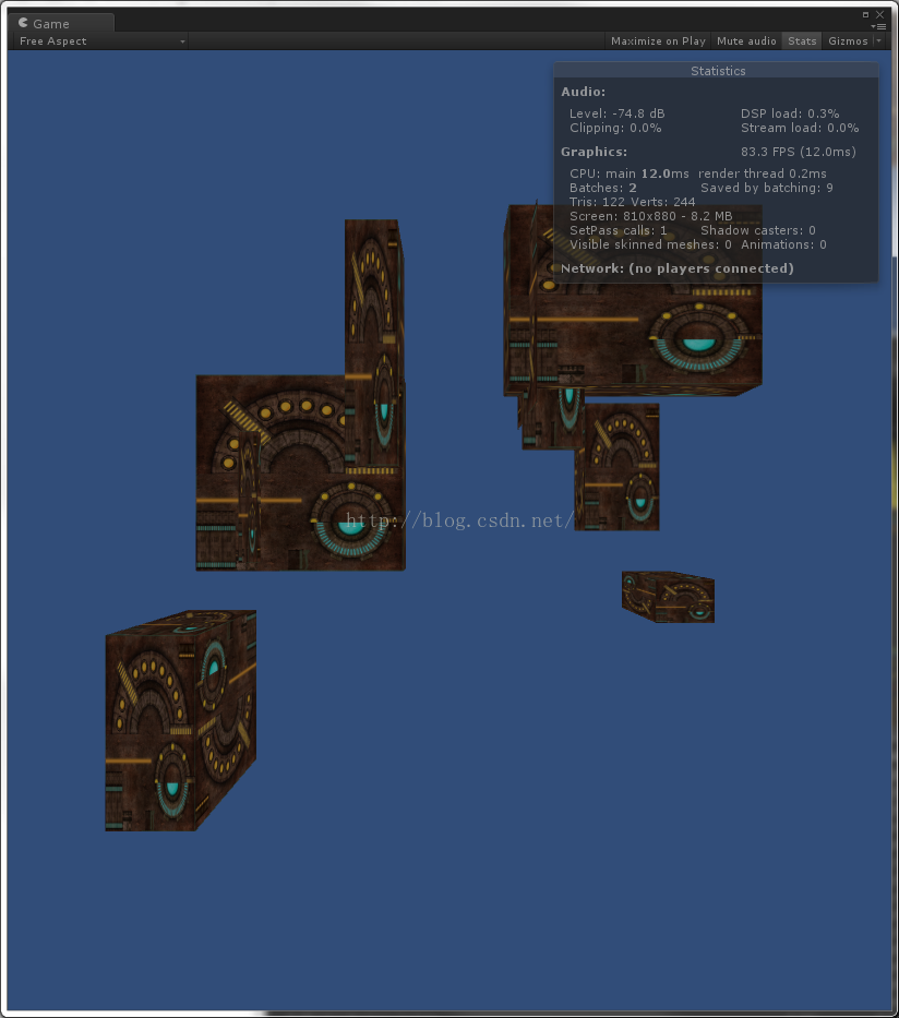 可以看出,3个物体,Save By Batching是2,说明有两个物体进行了一次批处理,SetPass Call是1,说明只有一个DrawCall,这是对的。在这个例子中,我是直接在场景中创建的物体。