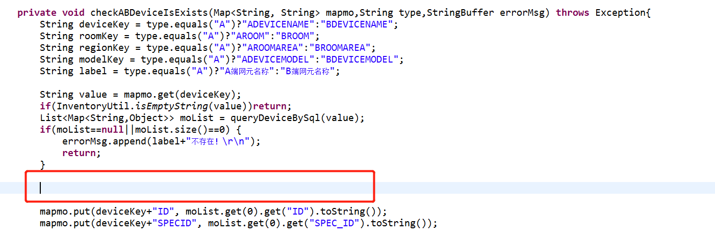 List<Map<String,Object>> moList = queryDeviceBySql(value); //因为账号的数据权限没有光缆专业,所以改为sql查询 private List<Map<String,Object>> queryDeviceBySql(Object value) throws Exception{ if(value==null) return null; String sql = "SELECT (SELECT S.OBD_LEVEL FROM CE_DEVICE_OBD_CCS S WHERE S.DEVICE_ID = D.ID) OBD_LEVEL," + "D.* FROM CM_DEVICE D WHERE D.SHARDING_ID = ? AND D.NAME = ?"; return metaService.query(sql, new Object[]{SecurityUtils.getCurrentShardingId(),value}); }
