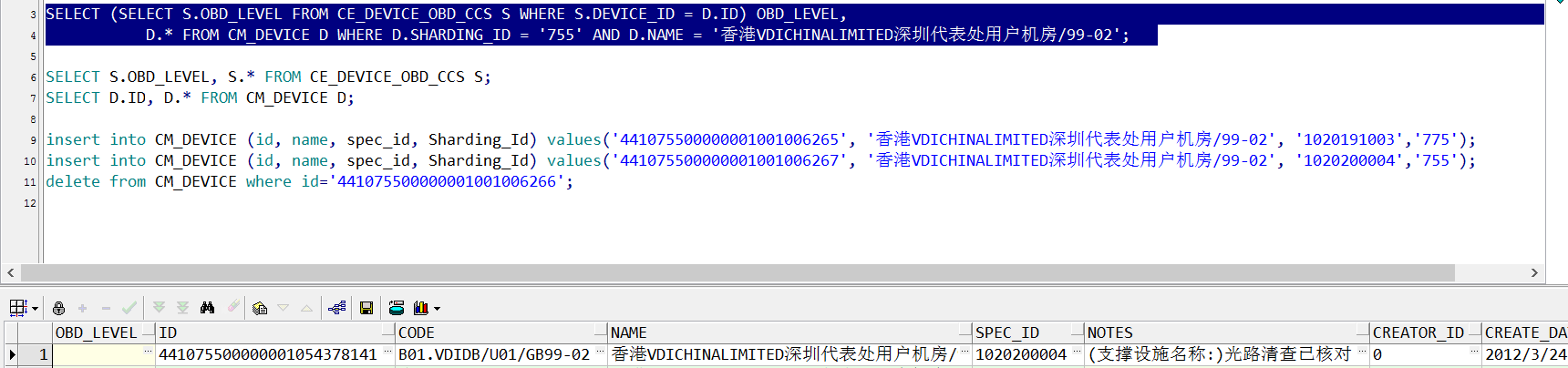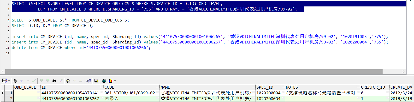 可以看到查询到一条记录,既然想代码走我写的那个逻辑,就必须是查询到多条语句,好的方向对了,现在来准备向CM_DEVICE表中插入相同NAME,ID,Sharding_ID的一条记录。