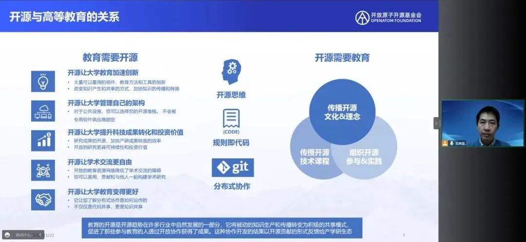 朱其罡分享了《开源与开放式学习》,他表示,开源为教育提供了无数的资源和工具,提高了全民接受教育的机会,降低了技术门槛,让前沿技术更容易触及。将开源与技术融入教育,有助于深层次的学习与知识的传播,有利于师生之间的合作学习,有益于学生归属感的培养。同时,开源也带来了教育模式的创新,让学习者成为知识的创造者,通过分布式协作网络促进学习者解决问题,产生新的知识。