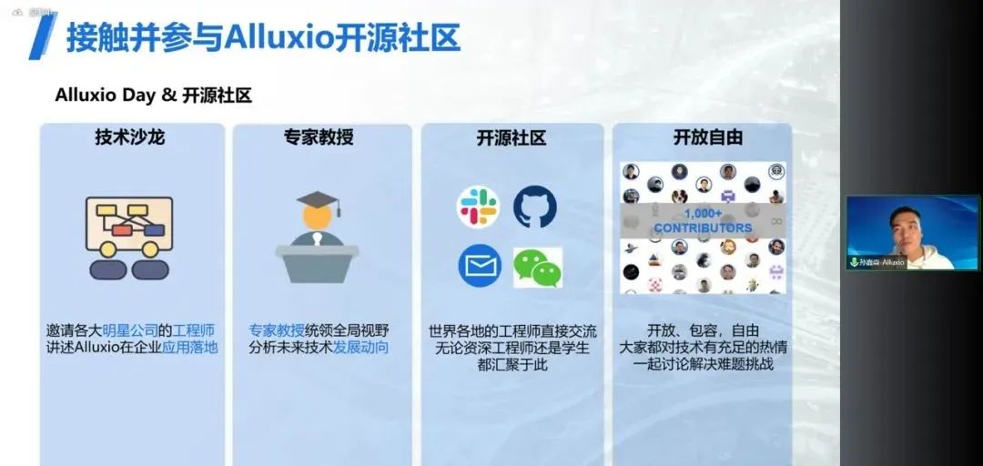 Alluxio社区的两位演讲人分享了《Alluxio开源社区演进的全球化开发协作与北邮学长心中的Alluxio》。王添钰介绍了Alluxio开源社区的背景和演进路线,分析了开源社区在全球开发协作的基础上所扮演的重要角色。接下来,孙嘉森结合亲身经历,分享了自己接触并参与Alluxio社区的故事,以及如何加入Alluxio开源社区。