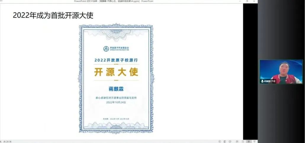 蒋麒霖分享了《开源心态,迎接职业发展》,围绕自己接受开源、融入开源社区、成为开源大使的心路历程,激励北邮学子积极拥抱开源。