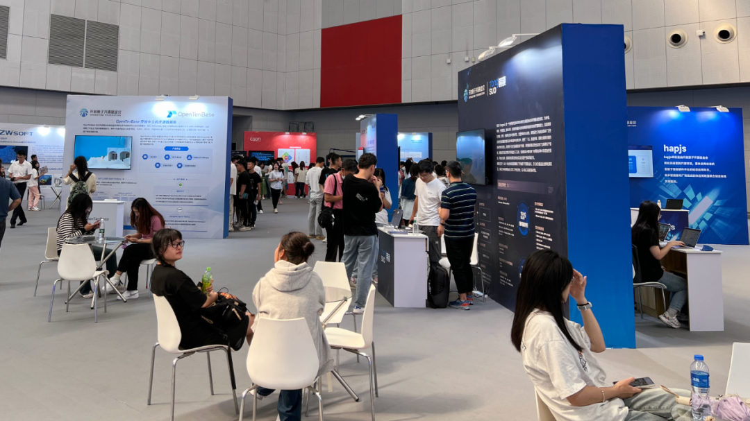 开源展区现场人流涌动,各参展企业及项目热情与观众交流,耐心解答疑问,分享他们在开源领域中的研究成果和实践案例,探讨开源项目发展,帮助现场观众更好地了解开源软件的最新技术动态和应用场景。