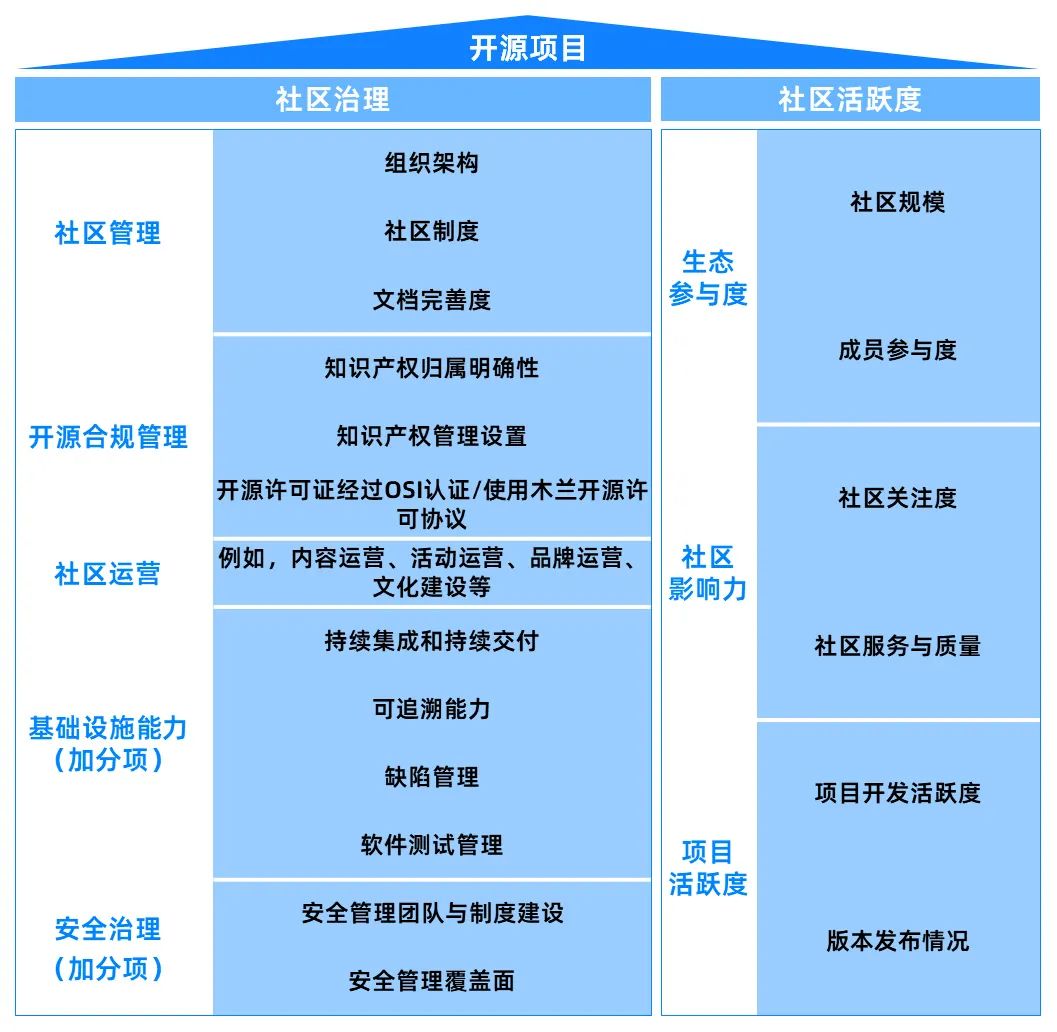 社区治理是开源项目取得发展与壮大的重要保证,评估标准考察社区管理、开源合规管理、社区运营、基础设施能力(加分项)、安全治理(加分项),多方面衡量开源社区的组织与运营情况。