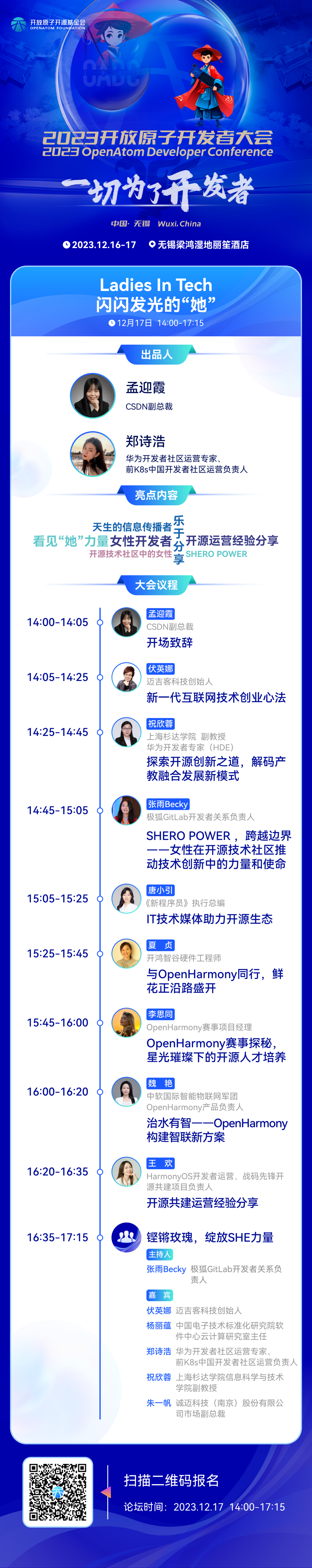 无论年龄、经验或背景。本次论坛都将为你提供一个富有洞见、鼓舞人心的体验。聊技术、谈人生、话未来,赶紧来 2023 开放原子开发者大会现场和最优秀的技术女孩们约起来吧。