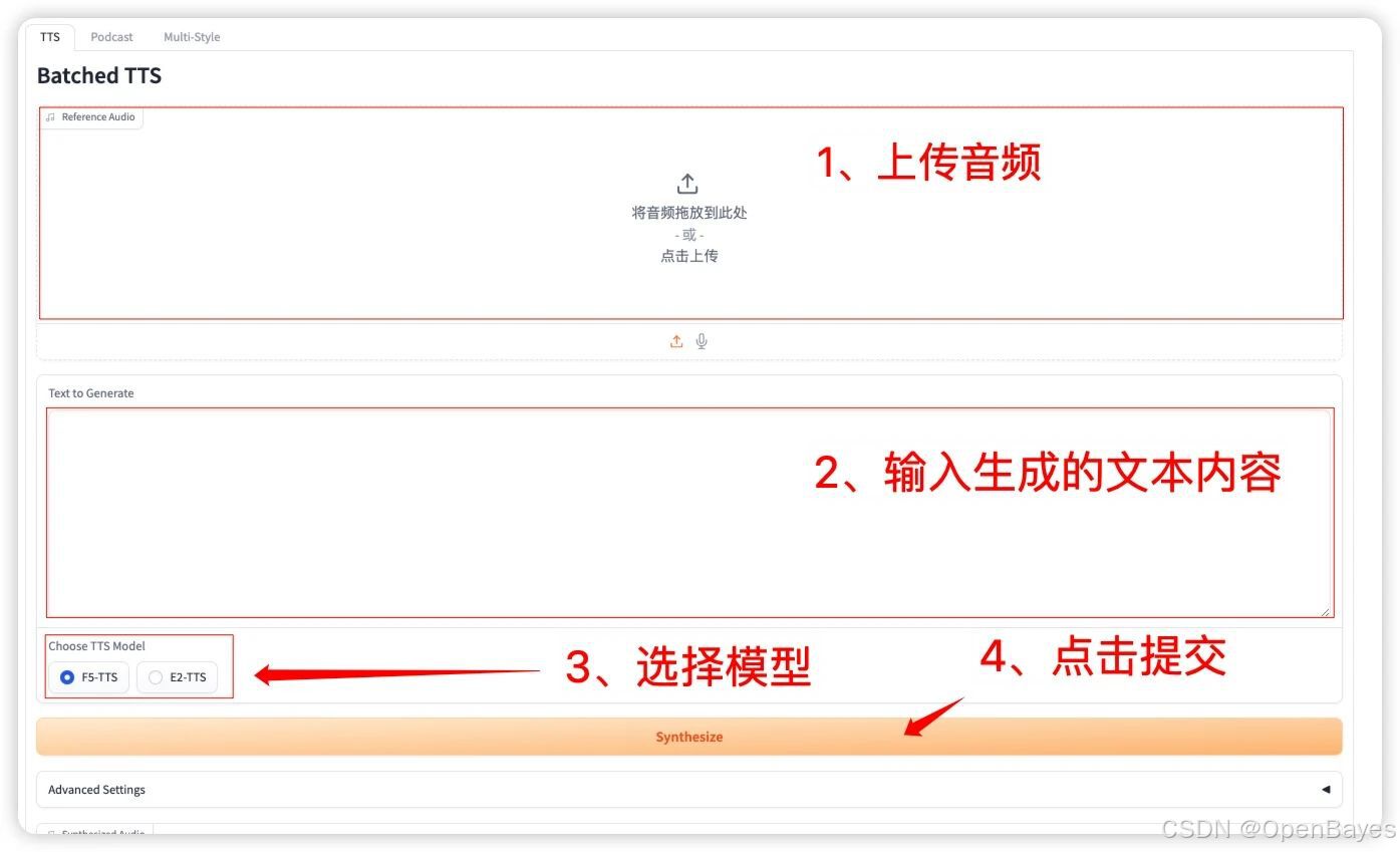 该教程包含了两个模型的 Demo 使用,分别为 F5-TTS 和 E2 TTS,只需按照示例步骤运行,即可体验音色克隆。