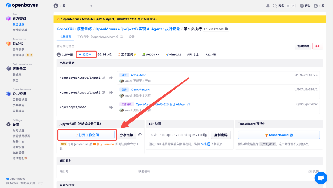 4. 确认无误后,点击「继续执行」,等待分配资源,首次克隆需等待 1 分钟左右的时间。当状态变为「运行中」后,点击「打开工作空间」。