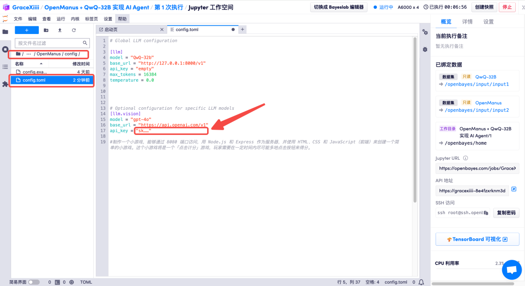 路径下的文件来添加视觉模型的 API 密钥,修改完毕后在此页面使用快捷键「control+s」保存文件: