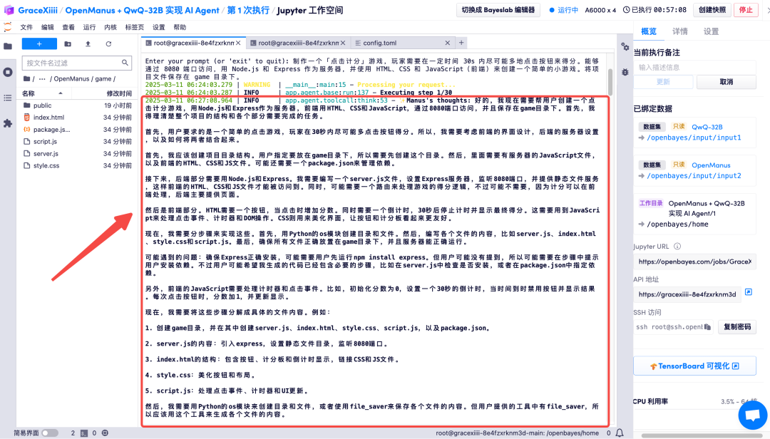 制作游戏的过程中可以看到 OpenManus 的思考过程。
