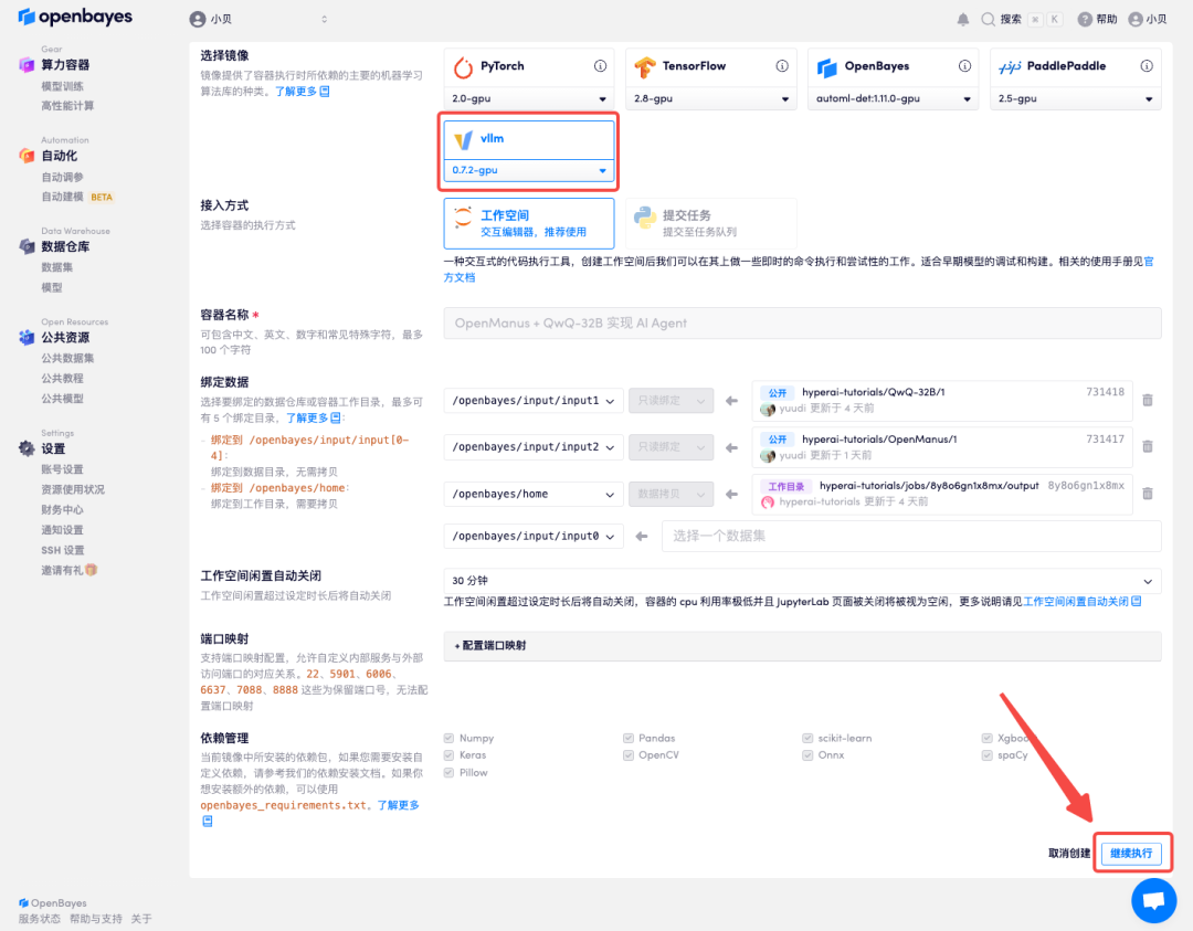 3. 选择「NVIDIA RTX A6000-4」以及「vllm」镜像,点击「继续执行」。OpenBayes 平台上线了新的计费方式,大家可以按照需求选择「按量付费」或「包日/周/月」,新用户可以使用文章开头的邀请码进行注册,没抢到邀请码的朋友别灰心,使用下方邀请链接注册,可获得 4 小时 RTX 4090 + 5 小时 CPU 的免费时长!