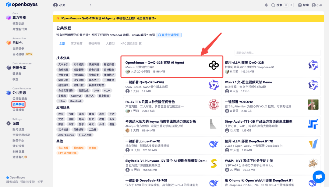1. 登录 http://OpenBayes.com,在「公共教程」页面,选择「OpenManus + QwQ-32B 实现 AI Agent」。