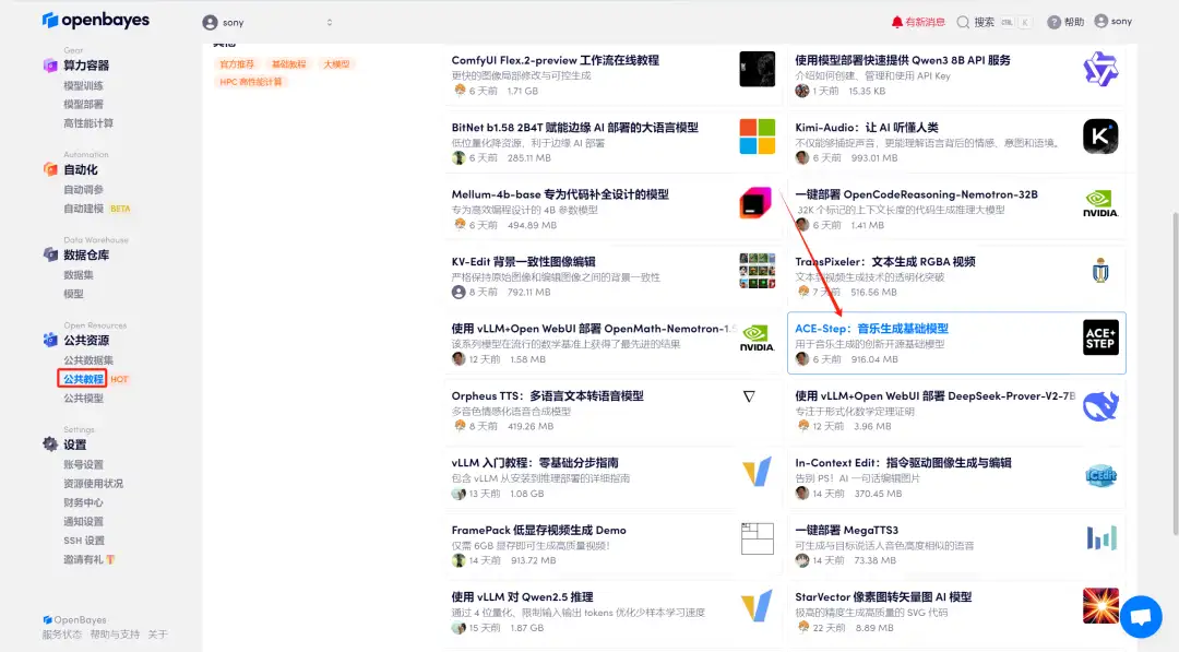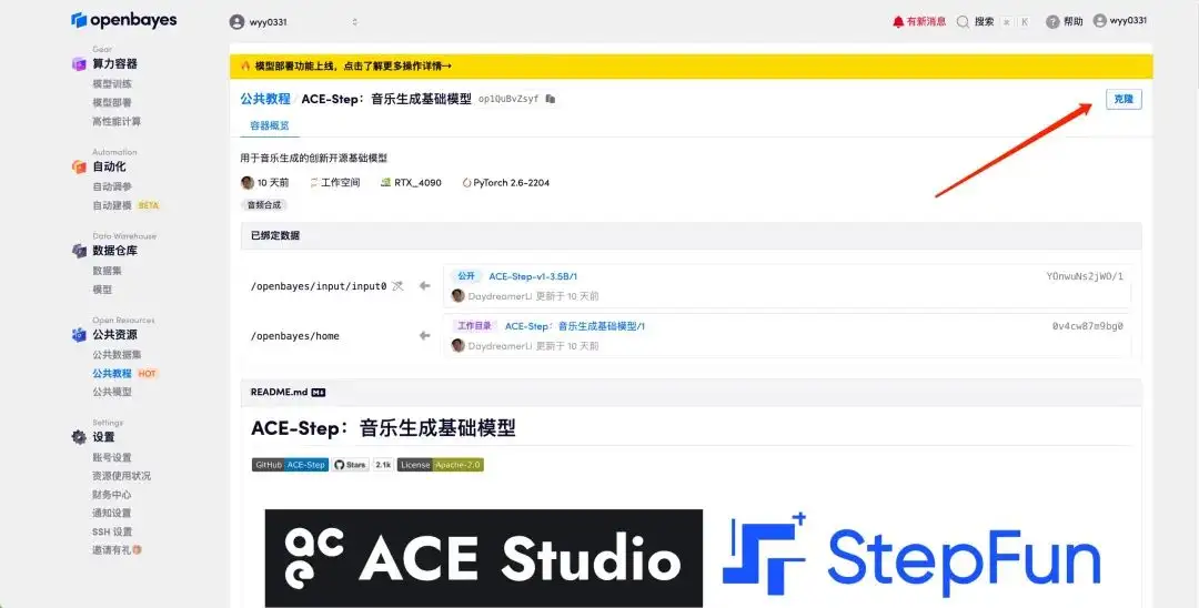 1.登录 http://OpenBayes.com,在「公共教程」页面,选择键部署「ACE-Step:音乐生成基础模型」教程。