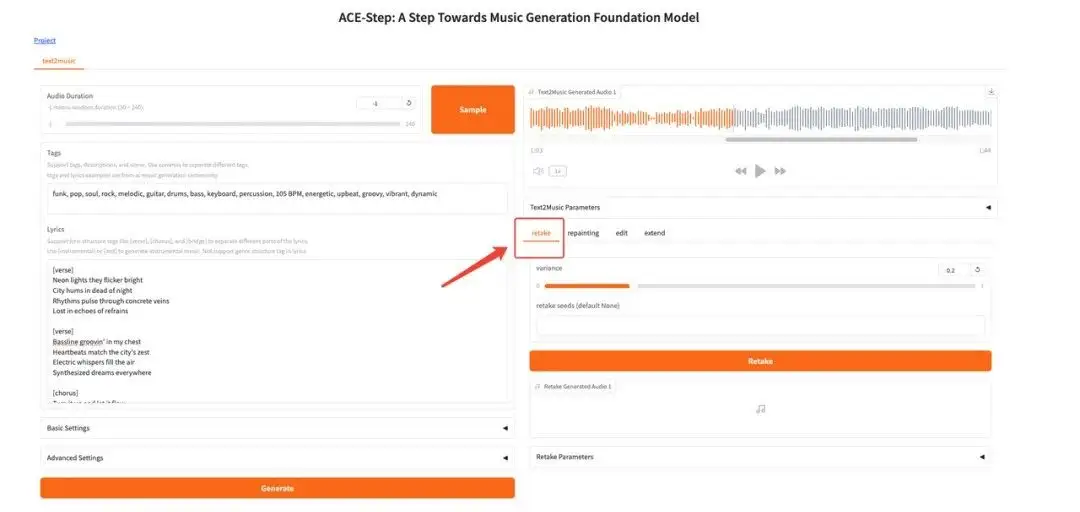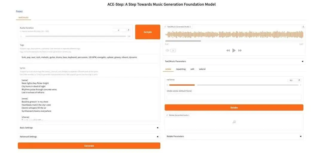 该项目提供多任务创作面板:Text2Music Tab、Retake Tab、Repainting Tab、Edit Tab 和 Extend Tab。