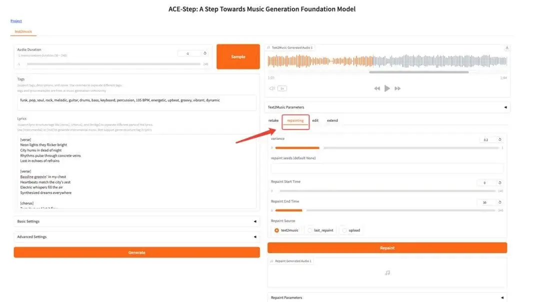 * Repaint Source:选择源音频(text2music 、 last_repaint 或 upload)