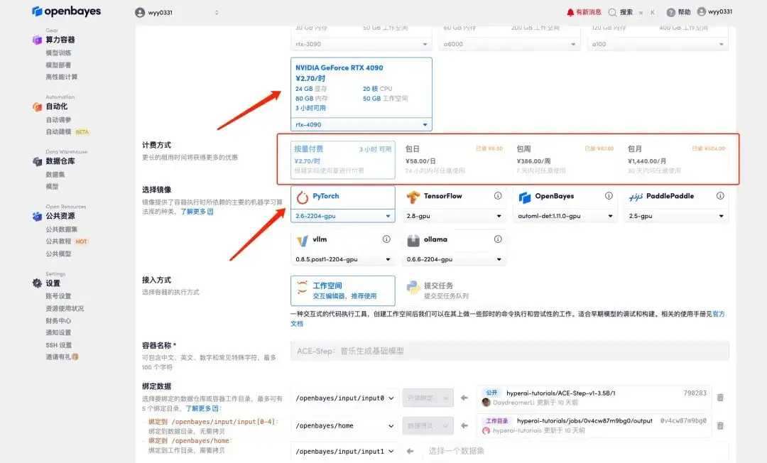 3.选择「NVIDIA GeForce RTX 4090」以及「PyTorch」镜像,OpenBayes 平台提供了 4 种计费方式,大家可以按照需求选择「按量付费」或「包日/周/月」,点击「继续执行」。新用户使用下方邀请链接注册,可获得 4 小时 RTX 4090 + 5 小时 CPU 的免费时长!