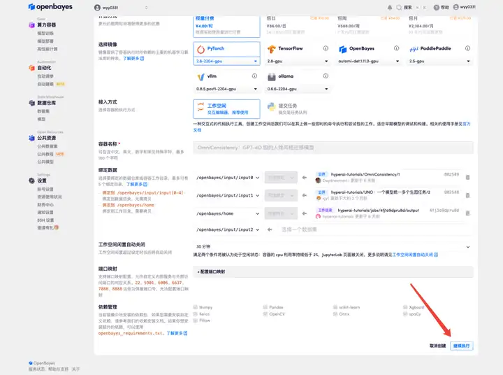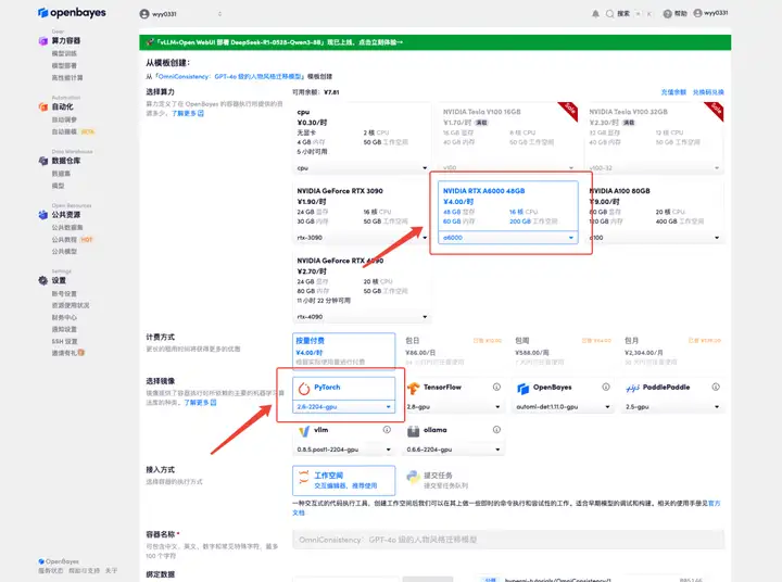 3. 选择「NVIDIA RTX A6000」以及「PyTorch」镜像,OpenBayes 平台提供了 4 种计费方式,大家可以按照需求选择「按量付费」或「包日/周/月」,点击「继续执行」。新用户使用下方邀请链接注册,可获得 4 小时 RTX 4090 + 5 小时 CPU 的免费时长!