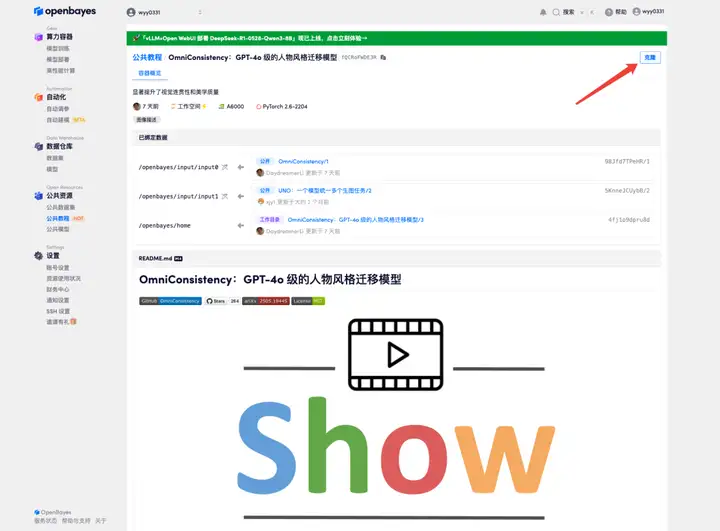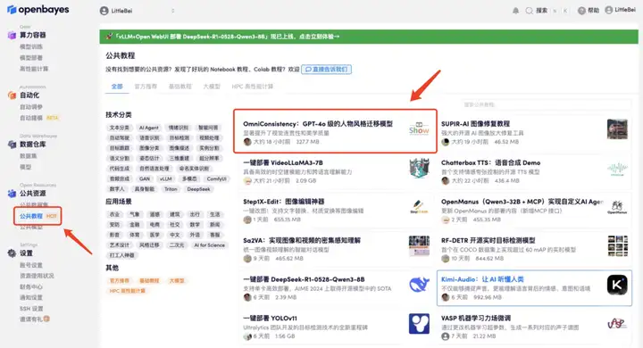 1. 登录 http://OpenBayes.com,在「公共教程」页面,选择「OmniConsistency:GPT-4o 级的人物风格迁移模型」教程。