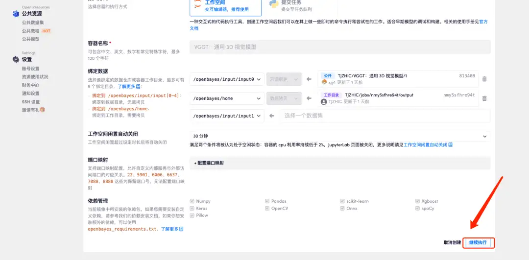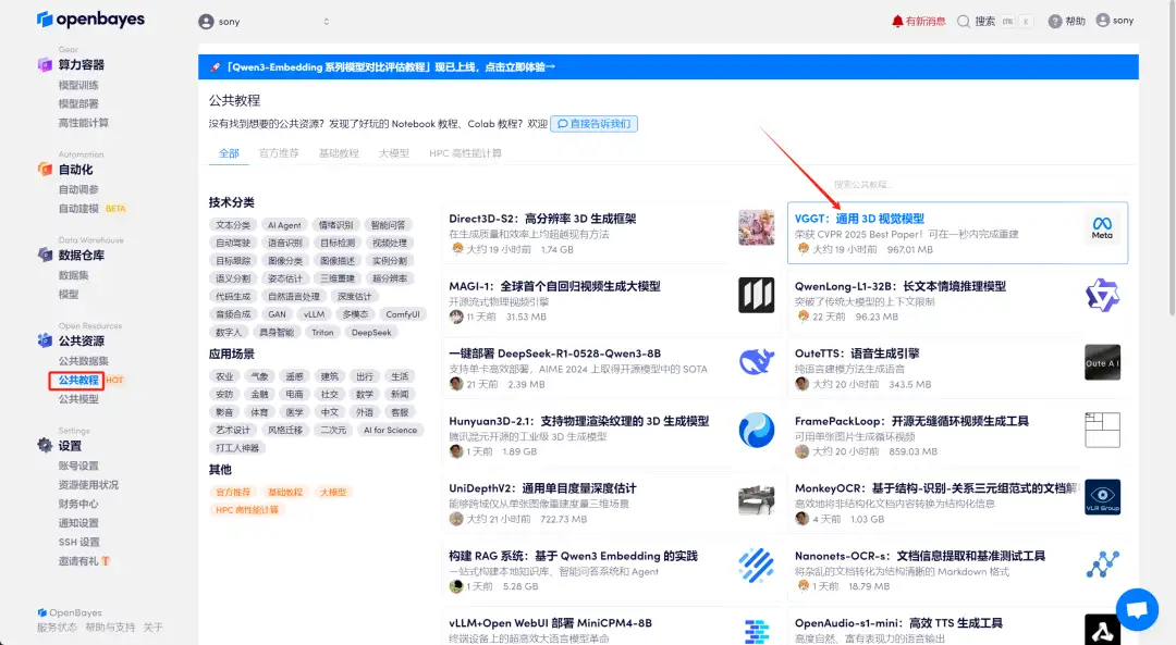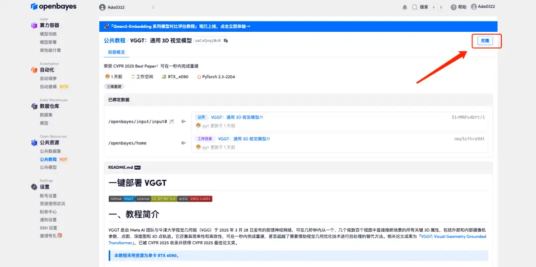 1.登录 http://OpenBayes.com,在「公共教程」页面,选择键部署「VGGT:通用 3D 视觉模型」教程。