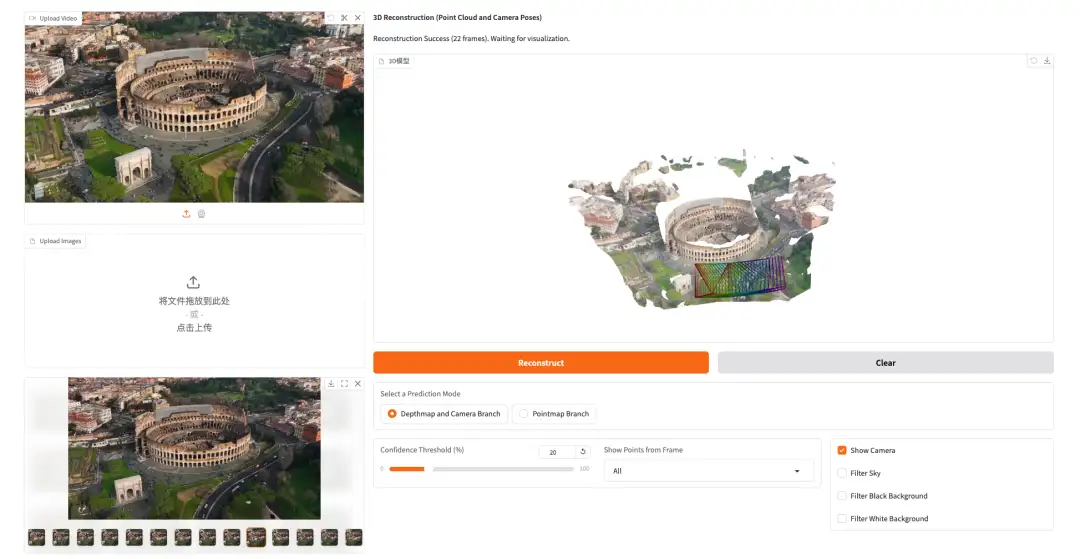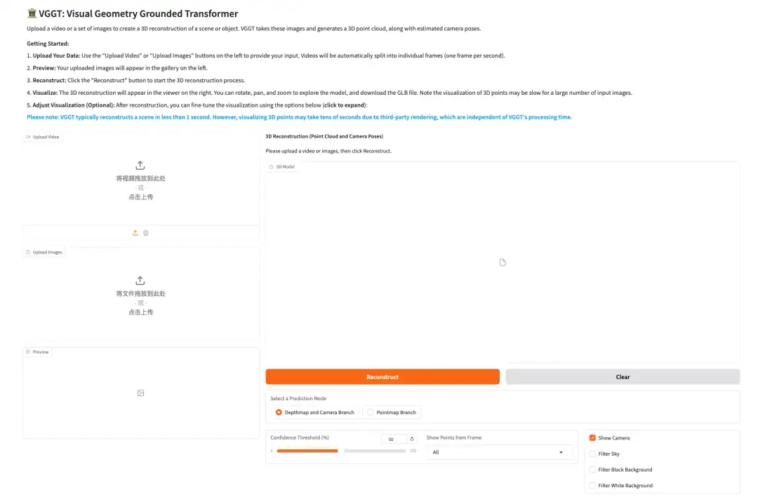 目前,「VGGT:通用 3D 视觉模型」教程已上线至 OpenBayes 公共教程中,支持一键部署体验效果,快来感受一下这项突破性成果的强大实力吧 ⬇️