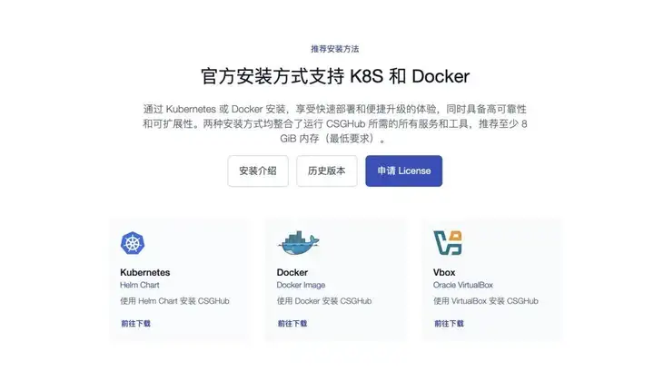 推荐安装方式:如果您希望快速启动并体验CSGHub,建议使用Docker方式进行安装。如果您的目标是长期稳定运行,并且希望在大规模集群中管理CSGHub,Kubernetes部署将是最佳选择。而对于本地虚拟化需求,则可以选择VirtualBox安装方式。