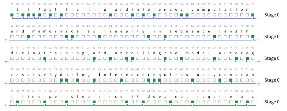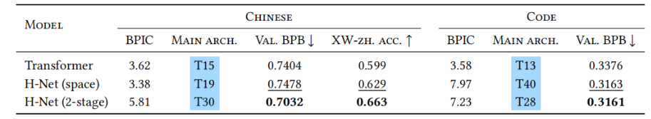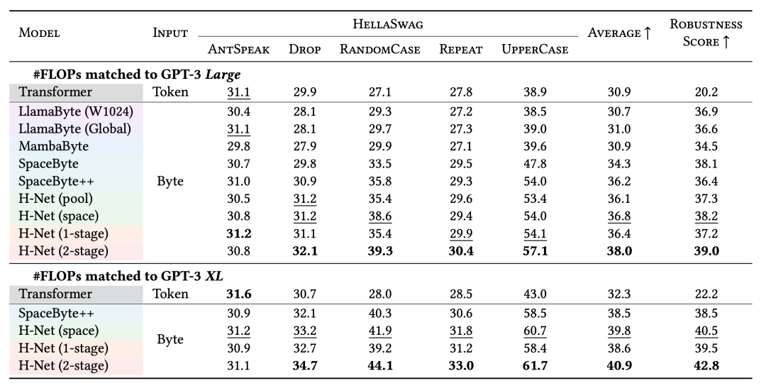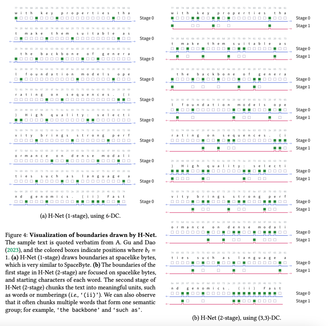下图为H-Net(第一阶段)动态绘制的边界位置可视化。给定的文本经过扰动处理,部分空白字符被删除。即使单词边界未被明确空格分隔,H-Net仍能准确检测到词边界,而BPE传统分词方法必须依赖明确边界字符进行有效分词。