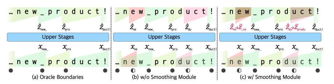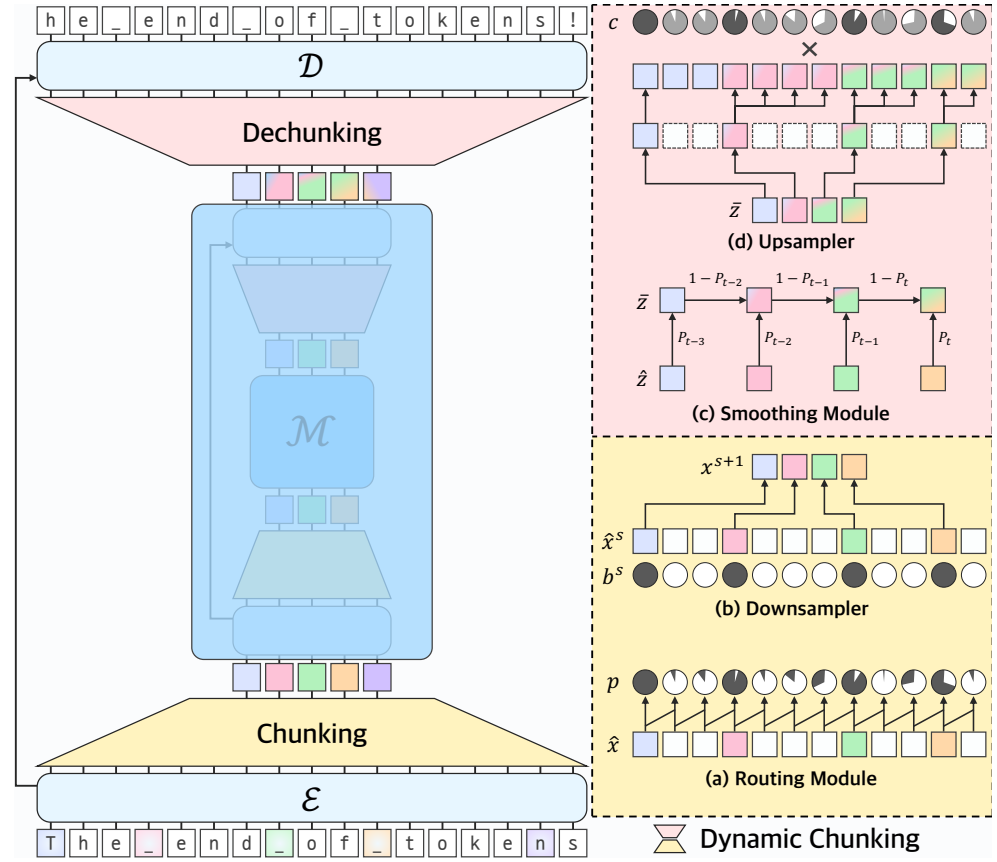 DC是H-Net的核心组件,通过可学习的路由模块(Routing Module)和平滑模块(Smoothing Module)实现数据依赖的分块策略。路由模块基于相邻向量的余弦相似度预测边界概率,而平滑模块通过指数移动平均(EMA)将离散分块操作转化为可微分计算,解决了梯度传播难题。两者结合使模型能动态压缩输入序列,同时保留语义关键位置。
