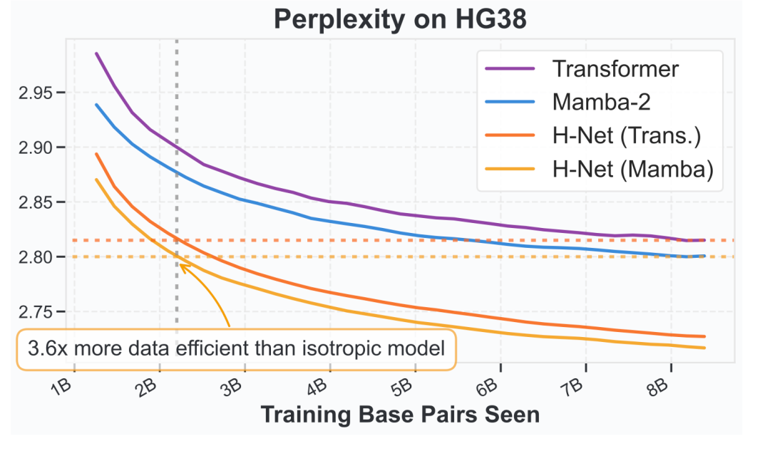 在同等计算资源下,字节级H-Net不仅超越传统分词模型,其多层抽象架构更展现出指数级的数据效率提升 -