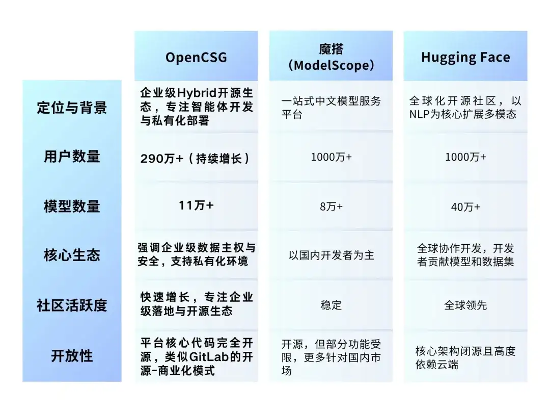 Gemini:HuggingFace和魔搭侧重社区与云端。OpenCSG还专注于企业级,提供私有化部署,并赋能AI主权,确保数据与系统本地可控。