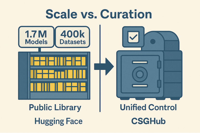 然而,这种表层上的相似性,掩盖了两者在设计哲学上的深刻分歧。它们并非单纯的竞争对手,而是构建 AI 生态系统的两种截然不同的架构蓝图。Hugging Face 提供的是一个开放繁荣的社区创新引擎 (Community Powerhouse) 蓝图。相比之下,CSGHub 提供的是一个安全、受治理的企业安全要塞 (Enterprise Fortress) 蓝图。