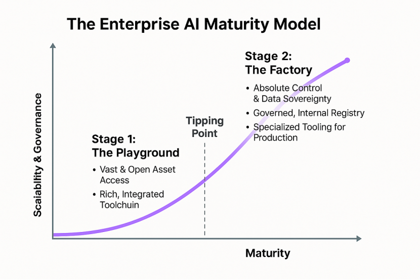 企业集成人工智能(AI)的过程,并非一蹴而就的跳跃,而是一个多阶段的演进过程。它通常始于一个可被称作“试验场”(Playground)的环境——这里为探索、快速学习和无拘束的创造力进行了优化。而当 AI 证明其价值并成为业务关键一环时,组织就必须将这个“试验场”升级为一座“工厂”(Factory)——一个为实现可规模化、高可靠性的生产而构建的,具备高安全性与严格治理能力的稳健环境。