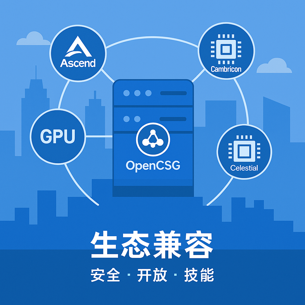 CSGHub 支持多种异构算力平台,兼容 NVIDIA GPU、华为昇腾、寒武纪、燧原、天数智芯、昆仑芯、海光等主流 AI 加速芯片,并适配 X86 与 ARM 架构,满足高校多样化部署需求。