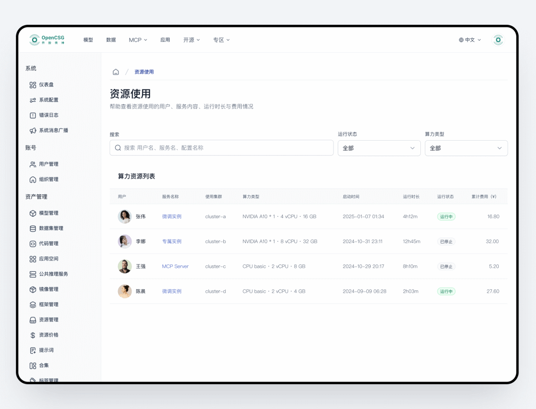 CSGHub 提供强大的资源调度服务。用户在启动科研项目时,平台能即时调度匹配的计算实例,并自动加载所需的软件环境、数据和文件。项目结束后自动释放运算资源并持久化存储,显著提升计算资源利用率,降低算力成本。