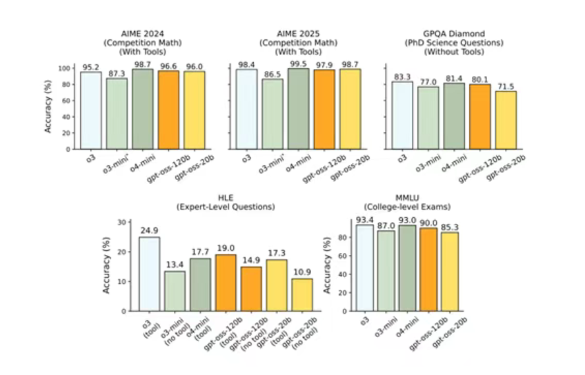 根据GPT-oss的测试数据显示,其推理、工具调用能力非常出色,可媲美OpenAI的前沿模型o4-mini。