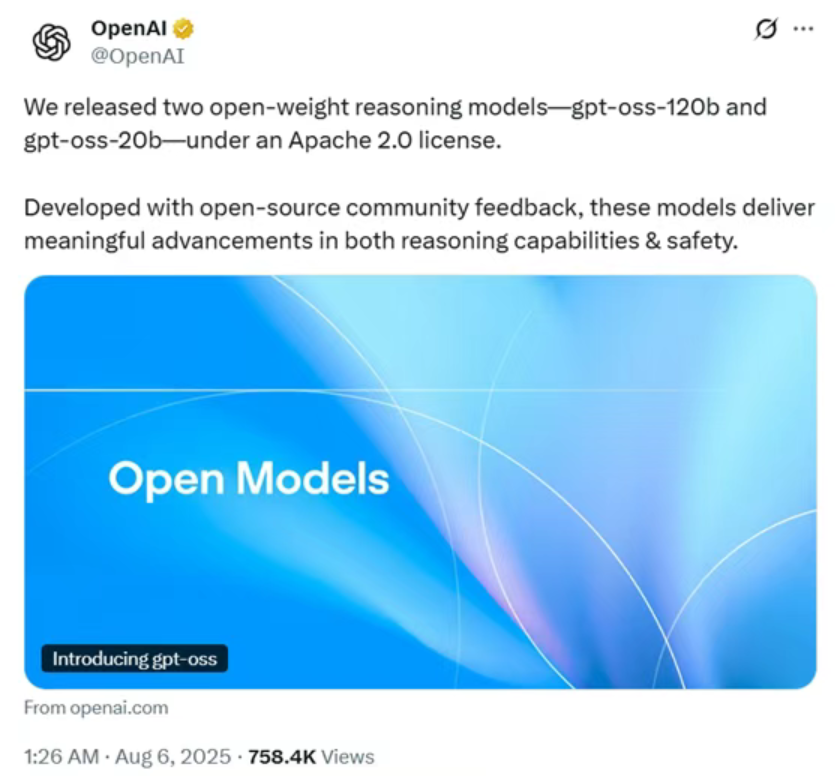 OpenAI突然宣布开源其最新大模型 GPT-oss ,包含1200亿(120B)和200亿(20B)参数两个版本,并采用 Apache 2.0开源协议,允许企业自由商用!