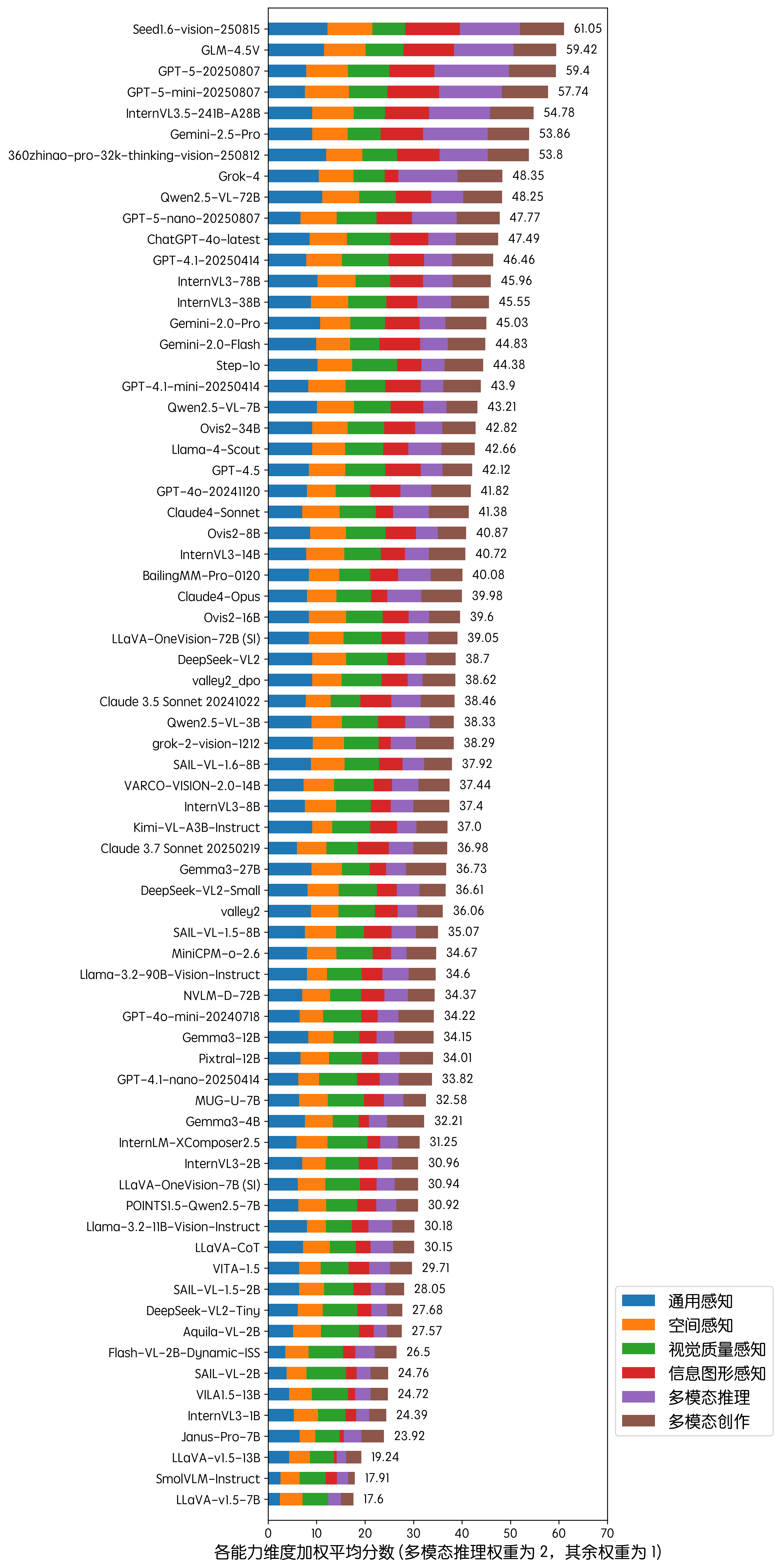 在以上三者之后,GPT-5-mini-20250807, InternVL3.5-241B-A28B 这 2 个模型分别占据了榜单的第 4、5 名。