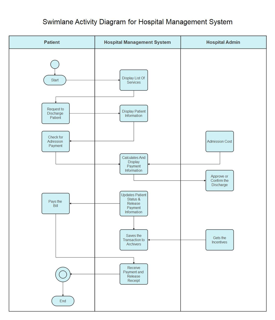 This Swimlane Activity Diagram is a powerful tool for visualizing and understanding the discharge process in a hospital management system. By clearly defining roles and responsibilities, it ensures that the system is designed to streamline operations and improve efficiency.