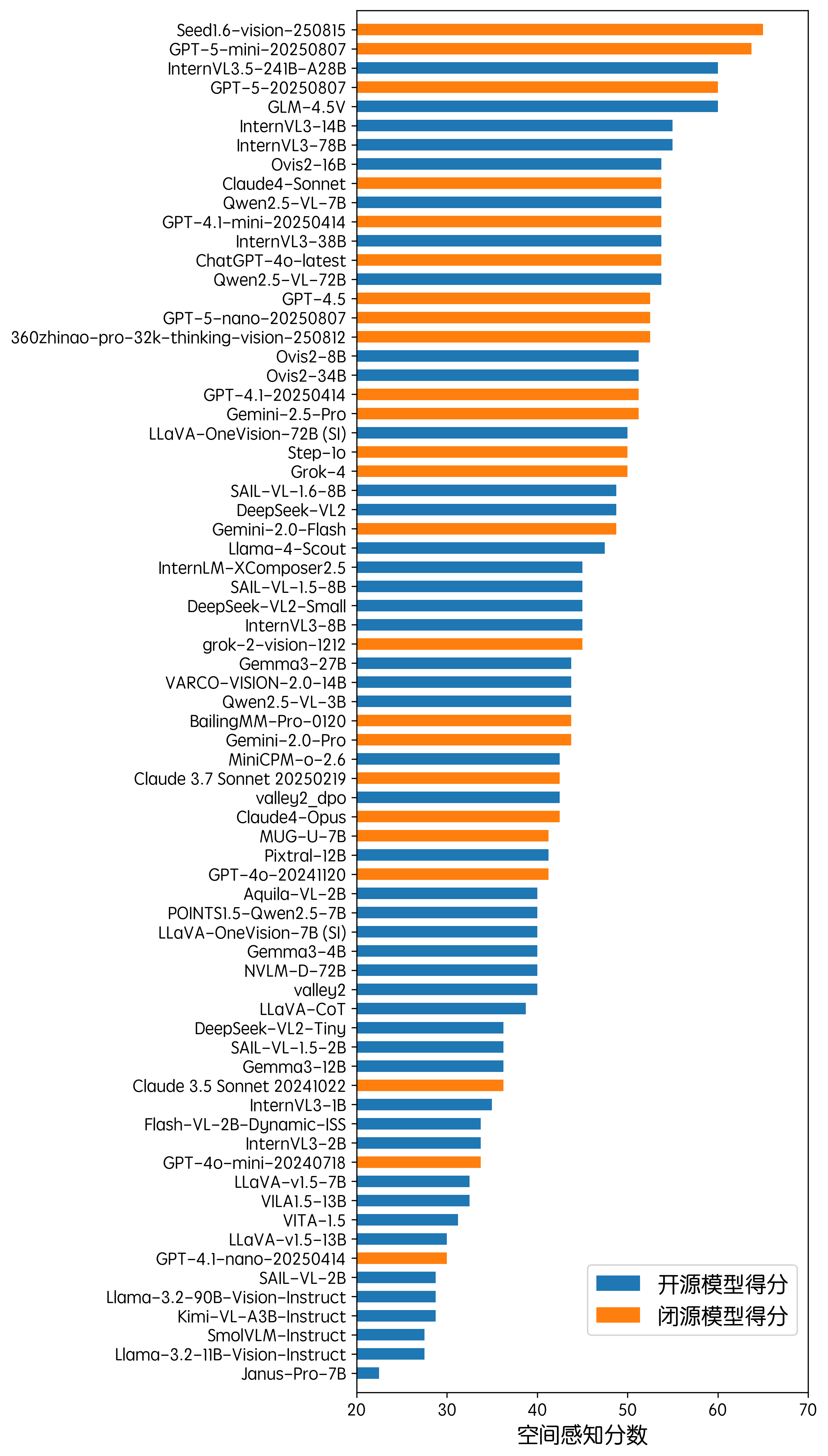 在空间感知方面,当前多模态大模型的能力相较上期榜单实现了一定的性能提升(Top5 全为新进模型),模型取得的最高分数首次突破 60 分,但整体表现仍有待加强。闭源模型在空间感知上实现了一定的性能突破,而开源模型相较上期进步相对有限。